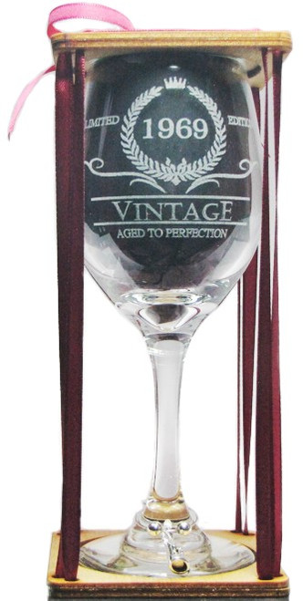 Your glass is engraved with Vintage 1969 inside a beautiful wreath design. It is embellished with a fun and decorative wine charm and arrives in beautiful presentation packaging that is ready for gift giving.