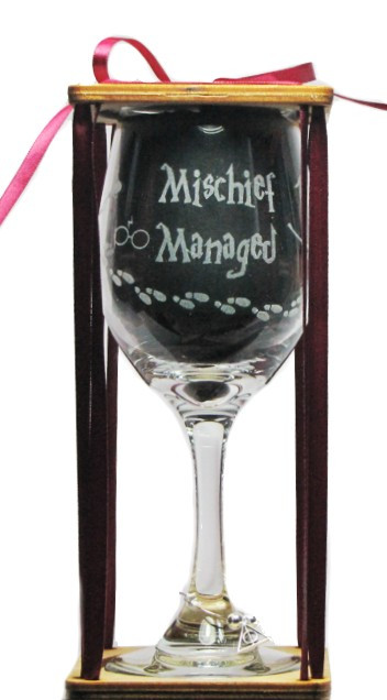 Your glass is engraved with Mischief Managed and has whimsical footprints and other symbols engraved 360 degrees around it. It is embellished with a fun and decorative wine charm and arrives in beautiful presentation packaging that is ready for gift giving.